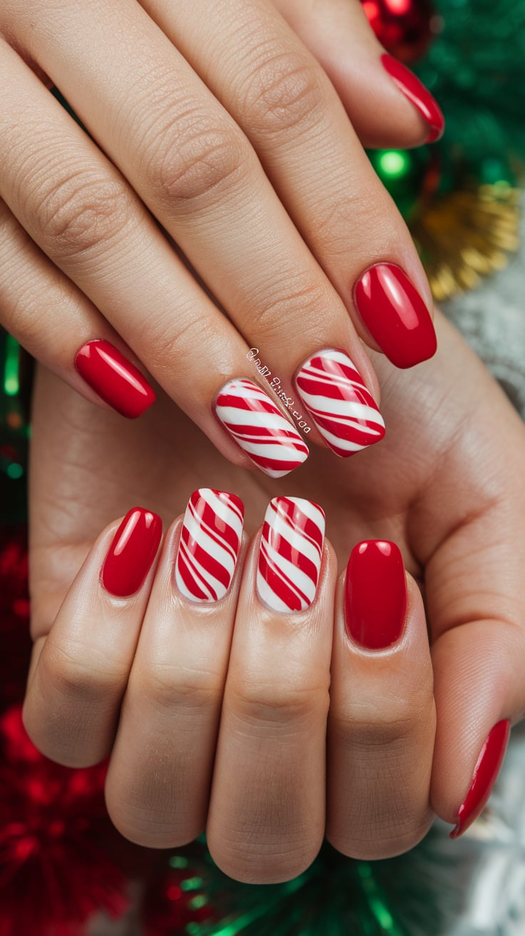 Turn every gesture into a holiday statement with Nailepic™ Candy Cane Luxe, a premium Christmas press-on nail set combining deep glossy red with classic candy cane striping for a bold, festive finish.