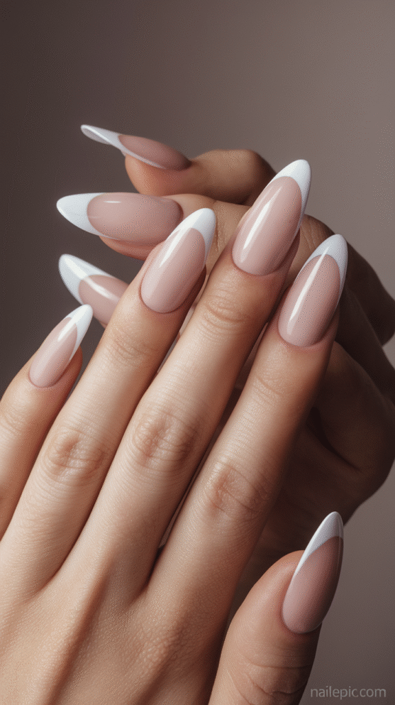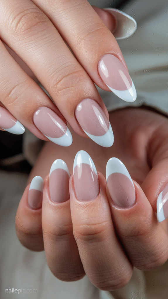 ⭐ 3️⃣ Glossy White French Tips Almond Shape